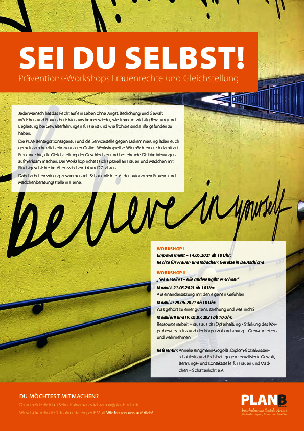 Schattenlicht e.V. läd zusammen mit der PLANB-Integrationsagentur und der Servicestelle gegen Diskriminierung zu einer Online-Workshopreihe ein, bei der Frauenrechte erklärt und die Gleichstellung der Geschlechter sowie bestehende Diskriminierungen diskutiert werden.
