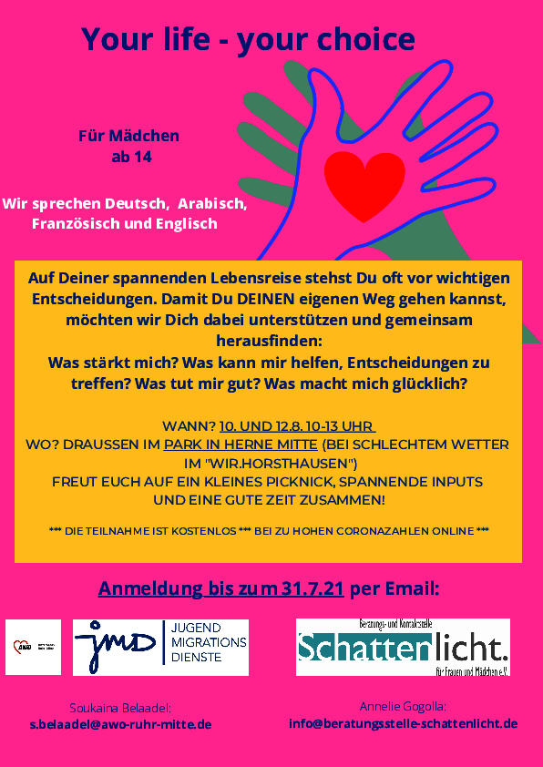 Unter dem Motto YOUR LIFE YOUR CHOICE läd Schattenlicht e.V. gemeinsam mit dem Jugendmigrationsdienst Mädchen zu einem Picknick im Park ein.